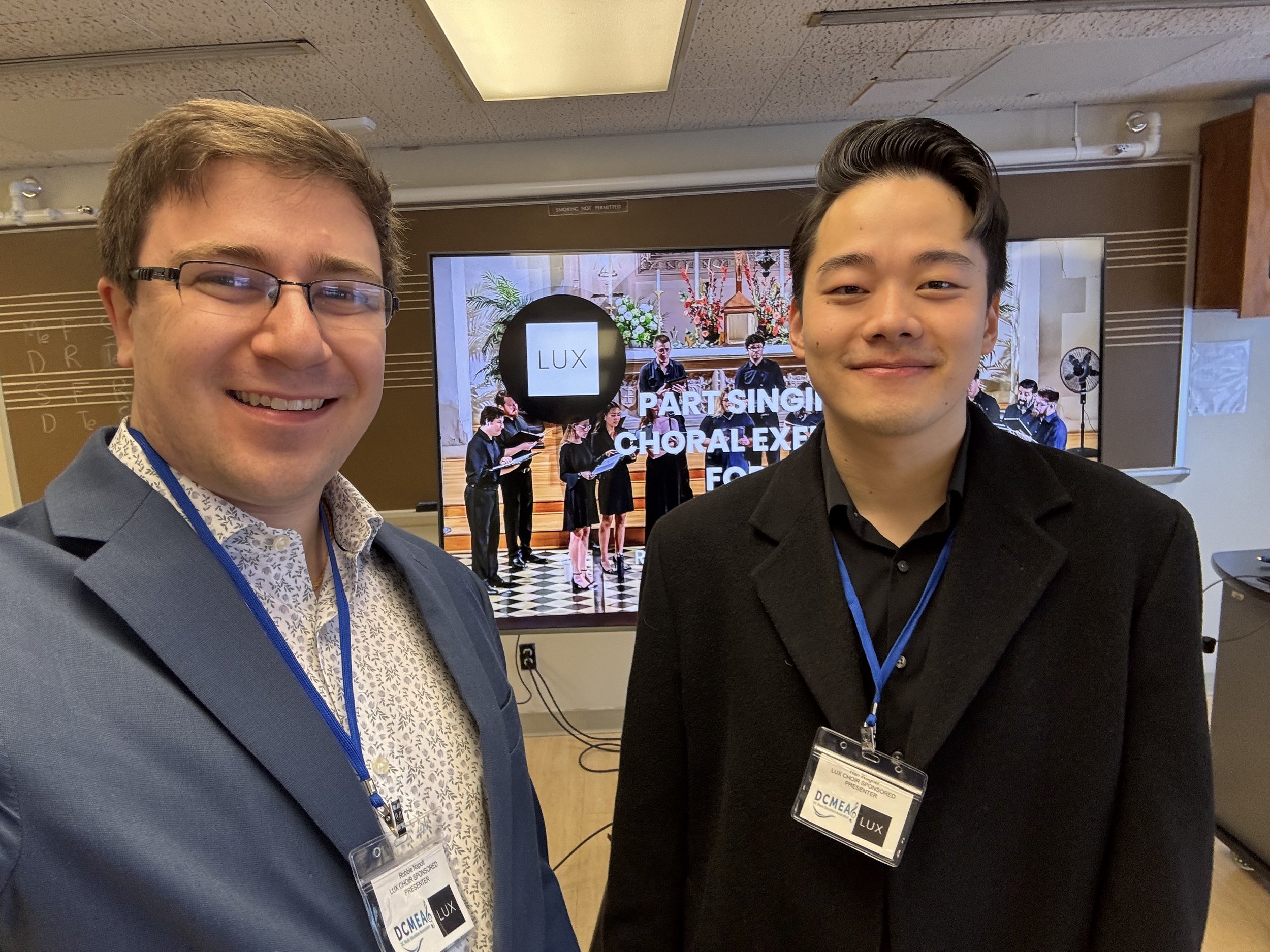 Thanks to Lux’s relationship with Washington, D.C.’s MEA chapter, Robby and Han Wagner (Lux’s then-Manager of Outreach, now Director of Operations) were approached about presenting at the DCMEA Winter Conference. The two educators and conductors created and presented a session entitled “Part Singing & Choral Exercises For All”, which focused on classroom and rehearsal strategies for building part independence in choral singers at all levels, from elementary to adults.